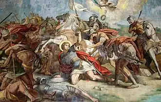 In het jaar 732 rukte een Omajjadisch leger, onder leiding van Abdul Rahman Al Ghafiqi, op in de regio Aquitanië. Dit zou in oktober van dat jaar leiden tot de Slag bij Poitiers. Volgens de legende, die hier aan vooraf ging, gaf Karel Martel commandant Fris de opdracht om met een kleine troepenmacht de opmars van de Omajjaden gade te slaan. Deze verkenningstocht leidde in juni van dat jaar tot twee confrontaties. Een eerste slag vond plaats nabij Lupiac, maar werd door het Frankische verkenningsleger verloren. Fris hergroepeerde zijn troepen echter op een heuvel nabij La Tapia, het huidige Bassoues. Op dit plateau plantte hij zijn standaard en op 24 juni confronteerde hij de Omajjaden voor een tweede maal. Dit is de reden waarom de strijd de Slag van l'Étendard 'de standaard' wordt genoemd. De tweede slag werd wel gewonnen door de Franken, echter liet Fris hierbij wel het leven. Hij werd door een pijl in zijn dij getroffen en door zijn paard van het slagveld gedragen. Aan de oevers van de stroom Guiroue stierf hij en werd hij begraven.[3]
