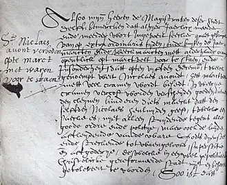 In de middeleeuwen werd op Duitse en Noord-Franse kloosterscholen het Sint-Nicolaasfeest gevierd. Tijdens een mirakelspel 'verscheen' de heilige voor de kinderen, en hij beloonde de ijverige leerlingen en vermaande de luie.[12] De Sint-Nicolaasviering liep van ca. 1300 tot ca. 1600 samen met het kinderbisschopsspel. Op 6 december werd in die tijd een kinderbisschop met aanhang gekozen. Zij werden tot 28 december (Onnozele Kinderen) van voedsel en geschenken voorzien. Andere kinderen kregen geld en een vrije dag om op 6 december feest te kunnen vieren. De waarschijnlijk oudste vermelding daarover komt uit Dordrecht en dateert van 1360: "op St. her Nyclaes dach I L. gr. aen die schoelers voer het oerlof".[noten 1] In 1363 gaf de heer van Gouda, Jan van Blois, te Dordrecht "den scoelnaers tot hoere hoechtijt van St. Nyclaes en horen bisscop 5 L. 4 S."[noten 2] In 1403 is er sprake van het uitdelen van "honinc, claescoeck en taert aen die kynders, op hunne patroen St. Nyclaes".[noten 3][13][14] In de Utrechtse Nicolaaskerk werd vanaf 1427 geld in kinderschoenen gedaan. Kinderen gingen in die tijd verkleed in een optocht door de straten en kregen bisschopsgeld van voorbijgangers. Soortgelijke tradities komen vandaag nog voor in andere landen, zoals het Chlausjagen in Zwitserland.