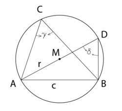 Teken bij de omschreven cirkel, bepaal daar het middelpunt van en teken de diameter . is dan volgens de stelling van Thales voor cirkels een rechthoekige driehoek. , omdat de koorde de overstaande zijde van in en die van in is.