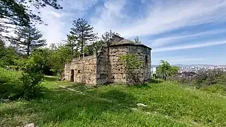 De basiliek is rechthoekig van plattegrond met een afmeting van ruim elf bij tien meter met drie beuken, verdeeld door twee paar monolithische zuilen. Het centrale schip is breder dan de zijbeuken en eindigt met een diepe hoefijzervormige apsis, die van buitenaf vijfhoekig is. De kerk had een zadeldak.[6]