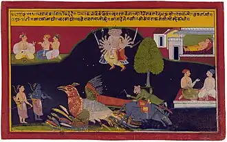 Sita wordt ontvoerd door Ravana, Jatayu wordt dodelijk verwond. Schilderij door Raja Ravi Varma -