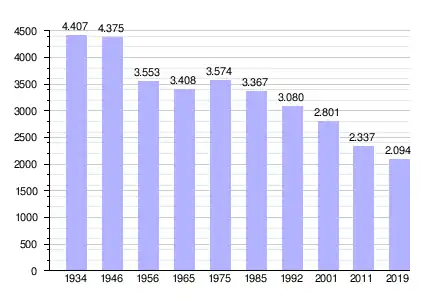 Op 31 december 2019 telde het dorp 2.094 inwoners, een daling ten opzichte van het maximum 4.407 personen in 1934.[1]