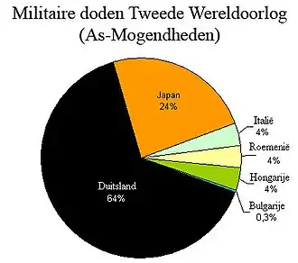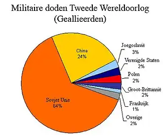 - Militaire slachtoffers - De slachtoffers zijn zowel degenen die in een gevecht zijn gesneuveld, als degenen die buiten een gevecht om zijn gesneuveld. Hierbij kan gedacht worden aan militairen die zijn gevangengenomen en zijn gestorven in krijgsgevangenschap. Het aantal militaire doden in nazi-gevangenschap ligt rond de 3,1 miljoen[8], terwijl het aantal gestorven militairen in Japanse krijgsgevangenschap ongeveer 540.000[9] bedraagt.