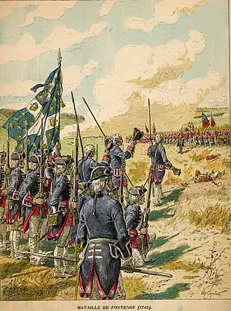 Voltaire, die toen historiograaf van Frankrijk was, heeft het begin van de veldslag gevat in een dialoog die zich in het collectief geheugen heeft genesteld. Volgens hem ontspon zich de volgende uitwisseling tussen Charles Hay, kapitein van de Engelse garde, en de graaf van Anterroches, kapitein van de grenadiers van de Franse garde:[1]