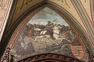 Lamoraal van Egmont staat in de Ridderzaal van het kasteel van Gaasbeek afgebeeld als overwinnaar van de veldslag.