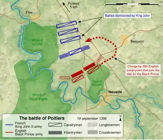 De Franse koning was herkenbaar aan de standaard, de oriflamme, die achter hem werd gedragen. De standaard werd altijd fel verdedigd: als de standaard viel, dan had men verloren. De Engelse John Chandos raadde zijn meester aan met de reserve-cavalerie onder de Captal de Buch de Franse koning aan te vallen. Deze was, zo was Chandos' redenering, "te moedig om te vluchten", en het doden of gevangennemen van de koning zou de slag beslissen.