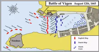 Bij Vågen lagen de vestingen van Bergenhus en Sverresborg. De vertegenwoordigers van beide vloten pleegden overleg met de Noorse vestingcommandant, Johan Caspar von Cicignon en de bevelhebber van de Noorse krachten Claus von Ahlefeldt, die voorlopig beslist buiten het geschil wilden blijven. Men had geruchten gehoord over een geheime overeenkomst tussen de Engelse koning Karel II van Engeland en koning Frederik III van Denemarken (Noorwegen was op dit moment in personele unie met Denemarken verenigd), maar geen concrete orders waren aangekomen. Onder het geldende verdrag mochten maximaal vijf oorlogsschepen van om het even welke natie de haven binnenlopen; Von Ahlefeldt maakte duidelijk hij niets anders zou toestaan.