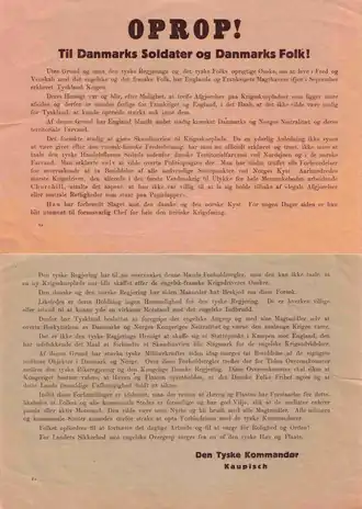 De Duitse infanterie stuitte bij Amalienborg op felle weerstand van een oefencompagnie van de Deense Koninklijke Garde (Den Kongelige Livgarde), die de eerste aanval afsloeg met slechts drie gewonden tot gevolg. Dit gaf koning Christiaan X en zijn ministers tijd te overleggen met de Deense legerchef generaal William Wain Prior. Aangezien deze discussie niks opleverde, vlogen verschillende formaties bestaande uit Heinkel He 111 en Dornier Do 17 over de stad en wierpen OPROP! (OPROEP!)-pamfletten af. Omdat gevreesd werd dat de Luftwaffe de burgerbevolking van Kopenhagen zou bombarderen en omdat alleen generaal Prior de strijd wilde voortzetten, capituleerde de Deense regering in ruil voor behoud van politieke handelingsvrijheid aangaande binnenlandse aangelegenheden.