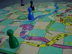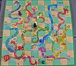 Slangen en ladders is een spel uit het hindoeïsme. Een slang geeft een slechte eigenschap weer en een ladder geeft een goede eigenschap weer.