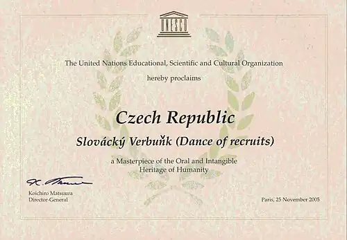 Sinds 2005 staat Slovácký verbuňk vermeld op de Lijst van Meesterwerken van het Orale en Immateriële Erfgoed van de Mensheid van UNESCO.