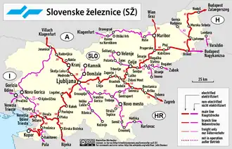 Het huidige netwerk van de Sloveense spoorwegen beslaat 1288 kilometer, waarvan 506 kilometer geëlektrificeerd is. Daarnaast is 331 kilometer dubbelspoor. In Slovenië rijden de treinen op 3 kV gelijkspanning, in tegenstelling tot in buurland Kroatië, waar 25 kV wisselspanning wordt gehanteerd. Doorgaande grensoverschrijdende treinen naar Zagreb moeten daarom in Dobova van locomotief wisselen.