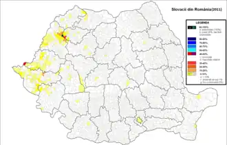 Volgens de volkstelling van 2011 wonen er 13.654 etnische Slowaken in Roemenië, oftewel 0,1% van de bevolking van het land. Ze leven met name in het westen van Roemenië. In de districten Bihor en Arad vormen ze 1,22% respectievelijk 1,25% van de totale bevolking. De grootste Slowaakse gemeenschappen zijn te vinden in Nădlac in het district Arad, waar ze met bijna de helft van de bevolking van de gemeente vormen, en in de gemeente Șinteu in het district Bihor, waar ze nagenoeg uitsluitend de hele bevolking omvatten.