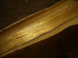 Met behulp van een laag eiwit of fijne klei en stijfsel wordt een basislaag gelegd op de gladgemaakte en gepolijste snede van het boekblok. Een reep bladgoud wordt op maat gesneden, op de basislaag gekleefd en na het drogen nogmaals gepolijst met agaat.