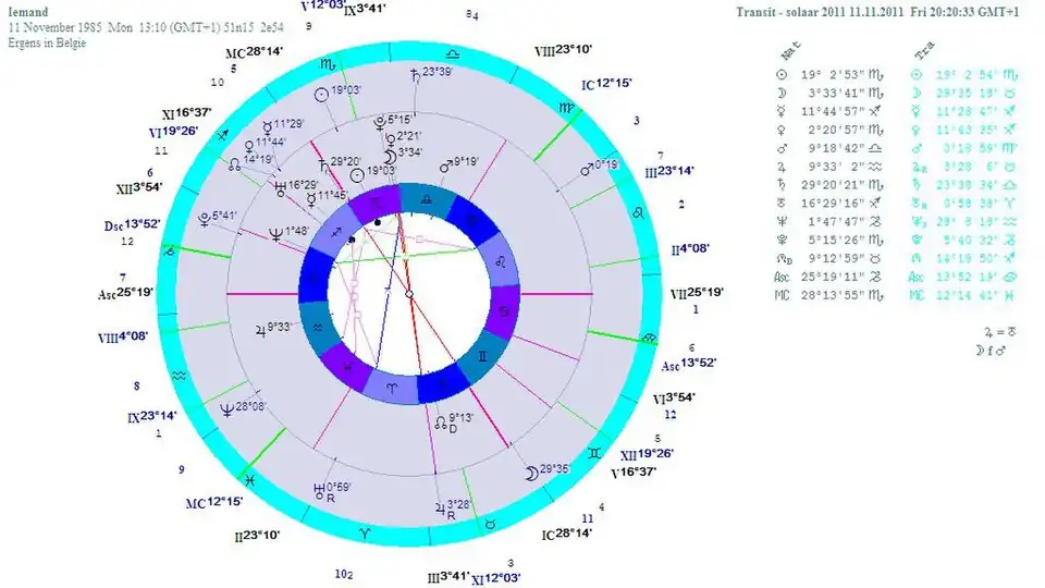 *In de tabel bovenaan rechts staan links de posities van de geboorteplaneten, Ascendant en MC, en rechts de posities van deze punten in de solaarhoroscoop.
