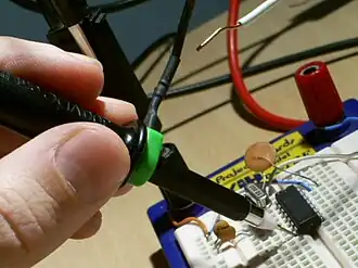 Typische passieve oscilloscoopsonde, die wordt gebruikt om een geïntegreerd circuit te testen.