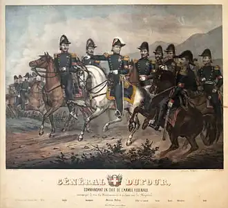 - ↑ «Dans la séance du 25, M. Dufour a été assermenté et a accepté le commandement tel qu'il lui a été conféré par la Diète», Nouvelliste vaudois (29 oktober 1847). geciteerd door du Bois, Pierre. La Guerre du Sonderbund, p. 144.