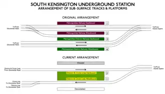 Op 24 december 1868 opende de Metropolitan District Railway (MDR), de latere District Line, twee sporen van het station als haar westelijke eindpunt. De Metropolitan Railway (MR) nam op dezelfde dag de verlenging van haar tak door Kensington in gebruik zodat ze in South Kensington aansluiting had op de MDR. Op 1 augustus 1870 werden tussen Gloucester Road en South Kensington nog twee extra sporen in gebruik genomen zodat de MR op de twee noordelijke sporen haar dienst kon onderhouden. De MDR kon zo haar pendeldienst tussen Gloucester Road en West Brompton via de twee zuidelijke sporen verbinden met de rest van haar traject zodat een doorgaande dienst ontstond vanaf West Brompton. Het station kreeg toen 4 perrons en een kopspoor voor de MR tussen het tweede en derde perron. De verbinding tussen beide maatschappijen was hiermee ook verlegd naar de oostkant van het station. In 1872 begon de middle circle dienst, de eerste aanzet tot de Circle Line, die vanaf Moorgate via Paddington en de West London Line de MDR bereikte en via South Kensington doorreed naar Mansion House. De huidige Circle Line is in 1949 geformaliseerd en gebruikt tussen Paddington en South Kensington de Kensingtontak van de MR. De lijn werd aan beide uiteinden verlengd en in 1884 werd, in samenwerking met de Metropolitan Line, de cirkel om de binnenstad gesloten. Het aantal reizigers groeide gestaag en om deze drukte op te vangen stelde de MDR voor om een expresslijn te bouwen. In 1897 verleende het parlement toestemming voor de bouw, maar tot voltooiing is het nooit gekomen. In 1966 is het station verbouwd waarbij het aantal sporen is teruggebracht tot 3 en de hele treindienst vanaf het eilandperron wordt afgewikkeld. In het kader van een stroomlijning van de treindienst zijn de buitenperrons buiten gebruik gesteld en heeft de Circle Line tussen South Kensington en Gloucester Road een eigen spoor om te voorkomen dat vertragingen op de ene lijn ook vertragingen op de andere veroorzaken.