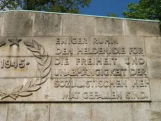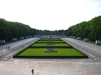 Vanaf de Puschkinallee komend, loopt men door een grote granieten poort. Daarin staat in het Duits en Russisch een tekst om de helden te eren: ‘‘Ewiger Ruhm den Helden, die für Freiheit und Unabhängigkeit der sozialistischen Heimat gefallen sind’’. Dan komt men op een soort voorplaats met daarop een 3 meter hoog vrouwenbeeld. Het beeld stelt ‘‘Mutter Heimat’’ (Moeder Vaderland) voor, een moeder die om haar gevallen zoon treurt. Vanaf hier opent zich de zichtas naar het hoofdmonument. Eerst komt men echter nog bij twee gigantische gestileerde roodgranieten vaandels, waarvoor zich een knielende soldaat bevindt. Aan de linkerkant een oudere, aan de rechterkant een jongere soldaat. In vol ornaat en met machinepistool bewijzen ze hun gevallen kameraden de laatste eer en waken over hun graven. Van hieraf loopt men over een denkbeeldig grafveld (de werkelijke graven van de gevallenen liggen aan de zijkanten en onder de grafheuvel). Het veld wordt geflankeerd door 16 marmeren sarcofagen, symbool staand voor de 16 toenmalige Sovjetrepublieken. Op deze sarcofagen zijn reliëfs met afbeeldingen van de krijgsgeschiedenis van de Sovjetvolken afgebeeld. Aan de kopse kanten zijn uitspraken van Stalin te lezen, links in het Russisch, rechts in het Duits.