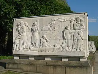 Het eigenlijke monument ten slotte is geplaatst op een (kunstmatige) grafheuvel. Het beeld is 12 meter hoog en weegt 70 ton. Het stelt een soldaat voor, die in de rechterhand een zwaard en in de linkerhand een kind vasthoudt. Met zijn laarzen vertrapt hij een hakenkruis. Het kind staat daarbij symbool voor "het onschuldige volk", dat zich nu "in de armen van de redder in een betere toekomst kan verheugen". Onder het beeld is een begaanbare koepel, waar een mozaïek te zien is. Het monument is het eindpunt van het in totaal 10 hectare grote complex. In totaal liggen meer dan 7.000 soldaten hier begraven.