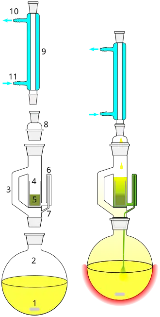 Het apparaat bestaat uit een warmtebron die het onderste reservoir met oplosmiddel aan de kook houdt. Het verdampende oplosmiddel condenseert in een koeler weer tot zuiver oplosmiddel in de vloeistoffase, dat in een hoger gelegen poreus filterbakje terugloopt waarin zich de te extraheren vaste stof bevindt. Hierin gaat een deel van de te winnen stof in oplossing. De vloeistof blijft aanvankelijk in deze extractiebeker staan. Het intensieve contact met het oplosmiddel bevordert het oplosproces van het te winnen materiaal. Het oplosmiddel verzamelt zich in dit hoger gelegen vat totdat een zekere maximale hoogte overschreden wordt. Het apparaat is zo geconstrueerd dat de verrijkte oplossing daarop in zijn geheel terug loopt in het onderste reservoir. De afbeelding toont de verfijning die dit mogelijk maakt, een overloophevel.