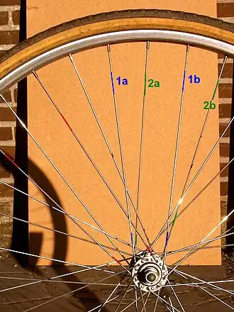 James Starley kwam met het idee om telkens een paar spaken te nemen en die langs elke kant van de as te laten vertrekken. Als men recht op de as kijkt, zoals in de figuur, krijgt men een spaak links (1a) en een spaak rechts (1b), die ongeveer diametraal tegenover elkaar aangrijpen op de as (zie figuur). In rust hangt de as als het ware aan de twee spaken. Als men de as doet draaien, bijvoorbeeld naar rechts, dan zal er aan de rechtse spaak getrokken en op de linkse geduwd worden. Dat duwen zal in de praktijk neerkomen op een vermindering van de spanning vergeleken met die in rust.