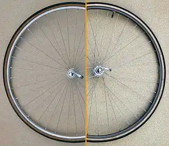Om het wiel te laten draaien (of af te remmen) via een aandrijving op de as moet er een moment doorgegeven worden van de as naar de velg. Dunne stalen spaken kunnen alleen een kracht uitoefenen in de richting van de spaak. Met dunne spaken, die radiaal ingebouwd zijn (zie linker helft van de foto), kan men geen moment doorgeven naar de velg: de krachtarm is nul. De as begint te draaien maar de velg niet, met als gevolg een hoge buigspanning op de spaken, die daardoor breken.