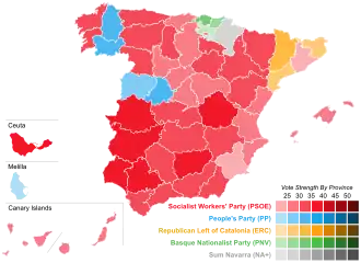 | PSOE | 7.480.755 | 28,68 | + 6,05 | 123 | +39 | ||
