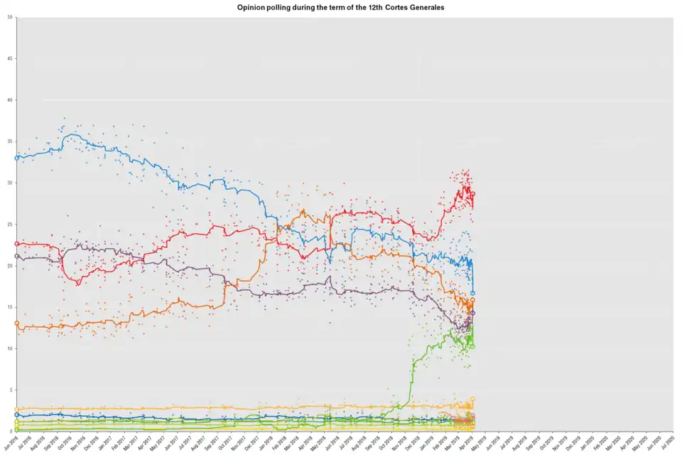 Vanwege het gefragmenteerde politieke landschap sinds het einde van het de facto tweepartijenstelsel sinds de elfde legislatuur, was er gedurende deze campagne aan de ene kant een machtsspel tussen twee partijenblokken: links met PSOE en UP, en rechts met C's, PP en VOX, en aan de andere kant binnen deze blokken, waardoor alle partijen zich presenteerden als de juiste keuzen om strategisch te stemmen. Dit werd versterkt omdat 40% van de kiezers bij aanvang van de campagne nog zwevend waren.