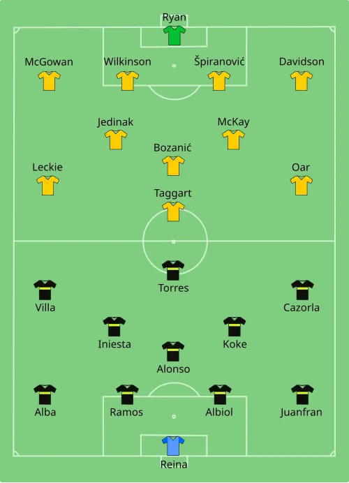Basisopstelling Spanje: P. Reina; A. Moreno, J. Martínez, G. Piqué, C. Azpilicueta; A. Iturraspe, S. Cazorla, Xavi; J. Mata, F. Torres, Pedro Reservebank Spanje: G. Deulofeu, D. Silva, S. Busquets, C. Fabrègas, A. Iniesta, I. Casillas, D. de Gea, R. Albiol Toegepaste wissels Spanje: | ||