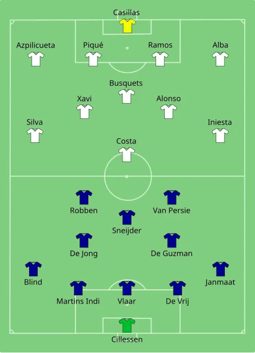 Basisopstelling Spanje: I. Casillas; J. Alba, S. Ramos, J. Martínez, C. Azpilicueta; T. Alcántara, S. Busquets, C. Fàbregas; A. Iniesta, D. Costa, Pedro Reservebank Spanje: P. Reina, V. Valdés, R. Albiol, Juanfran, X. Alonso, S. Cazorla, X. Hernández, J. Navas, Koke, D. Silva, A. Negredo Toegepaste wissels Spanje: | ||
