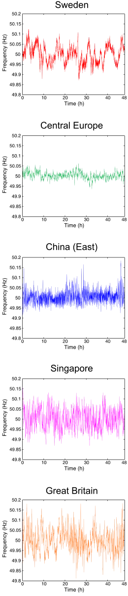 Hoe groter een elektriciteitsnet en hoe beter energiecentrales kunnen worden bestuurd, hoe stabieler de netfrequentie binnen een tolerantiebereik kan worden gehouden. In de afbeelding hiernaast wordt het verloop van de netfrequentie en de afwijking daarvan over 48 uur weergegeven voor sommige regelzones, die allemaal rond de nominale waarde van 50 Hz schommelen. In het West- en Centraal-Europese netwerksysteem (UCTE) treden de kleinste afwijkingen op. Vaak zijn echter de afgelopen jaren frequentieverschuivingen waargenomen als gevolg van handel op de beurs, wanneer centrales de nieuwe vermogenswaarde bij elke uurwisseling beëindigen en niet langer continu het uitgangsvermogen van de belasting van de besturingszone aanpassen tijdens de vervolgbewerking.