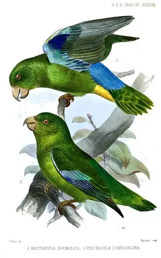 | Spengels muspapegaai (boven) en Groene muspapegaai (onder) | |||||||||||||