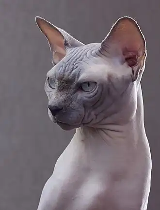 De Sphynx ziet er naakt uit, maar compleet haarloos is hij niet. De huid van een Sphynx is bedekt met heel korte donshaartjes. Als hij geaaid wordt, voelt hij warm aan en wordt het gevoel beschreven als dat bij de buitenkant van een perzik, suède of zeemleer.[3][4] Op de oren, snuit, voeten en staart mogen de donshaartjes volgens de rasstandaard iets langer zijn. De snorharen mogen aan- of afwezig zijn. Volwassen katten moeten hun huidplooien zo veel mogelijk behouden en voor de rimpels op de kop geldt; hoe meer, hoe beter.[3][4]