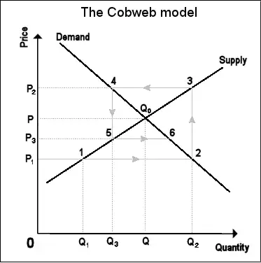 In bovenstaande grafiek ligt het evenwicht op het snijpunt van de vraag- en aanbodcurve bij een hoeveelheid Q en prijs P. Bij een slechte oogst in periode 1 (1 op de grafiek), zakt het aanbod naar Q1, en stijgen de prijzen naar P2. De hoge prijs zet de producenten aan om meer te produceren waardoor het aanbod stijgt naar Q2. Maar om de volledige productie verkocht te krijgen moet de prijs zakken naar P3. Dit proces herhaalt zichzelf, tot eventueel een evenwicht wordt bereikt bij Q0.