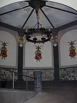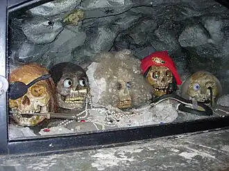 Verder zat er net links van de ingang een schedelvorm in de muur verwerkt. Ook zag je boven de toegangspoort een kop zitten met een dikke snor. Deze decoratie was ook in het klein te zien bij de twee kleine raampjes boven de poort.