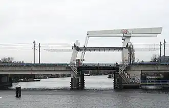 In 1842 werd hier een eikenhouten rolbrug gebouwd, ontworpen door F.W. Conrad. De brug had 5 overspanningen, vier daarvan waren vast en een was beweegbaar. Deze brug werd in 1863 vervangen door een gietijzeren kraanbrug, omdat het eikenhouten exemplaar te veel verzwakt was.[1] Aangezien de kraanbrug te licht was voor zware treinen met hoge snelheid, werd deze in 1891 vervangen door een draaibrug. In 1967 werd de draaibrug vervangen door een ophaalbrug. De huidige bruggen, die hoger zijn dan de brug uit 1967, dateren uit de periode 1987-1996 en zijn gebouwd in het kader van de spoorverdubbeling Leiden - Den Haag HS.