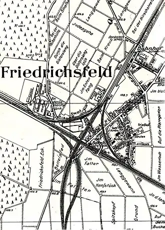 Het breedspoor traject van de Rheintalbahn met een spoorbreedte van 1600 mm tussen Mannheim Friedrichsfeld en Heidelberg werd tussen 1846 en 1855 voorzien van een derde rail met een spoorbreedte van 1435 mm ten behoeve van de Main-Neckar-Bahn tussen Frankfurt en Heidelberg / Mannheim. Naast het breedspoortraject met een spoorbreedte van 1600 mm tussen Mannheim en Mannheim Friedrichsfeld werd een apart treject met een spoorbreedte van 1435 mm ten behoeve van de Main-Neckar-Bahn aangelegd.
