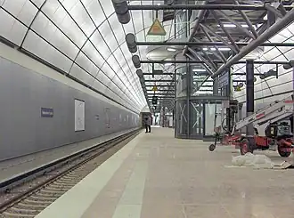 Door rechtszaken van bewoners tegen het project konden de werkzaamheden na een tweejarige vertraging op 11 april 2001 begonnen worden. De voltooiing stond optimistisch, en rekening gehouden met de rechtszaken in 2005.[4] Doordat de tunnel tijdens de werkzaamheden in 2004 is gaan lekken, werd de openstelling uitgesteld naar 2007 maar werd uiteindelijk 12 december 2008. Een dag voor de officiële opening werden gratis introductieritten aangeboden naar het station.