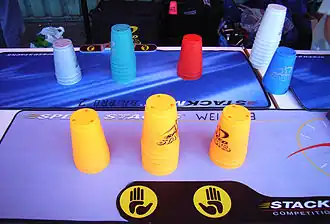 Dit zijn bekers van een speciaal, steviger materiaal dat schokken absorbeert. Ook hebben de bekers in plaats van drie kleine gaten één groot gat, wat de tijden aanzienlijk verbetert. Verder zijn deze bekers iets zwaarder, wat ervoor zorgt dat frommels (Fumbles in het Engels) minder vaak voorkomen. Deze bekers kunnen gewoon bij wedstrijden gebruikt worden, omdat ze door de WSSA goedgekeurd zijn. Emily Fox en Steven Purugganan gebruiken deze bekers.