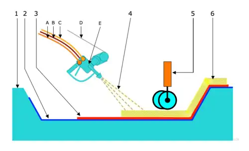 In een open mal (1) wordt een losmiddel (2) aangebracht. Het aanbrengen van het losmiddel gebeurt meestal met een verfspuit. Nadat het losmiddel is uitgehard wordt de gelcoat (3) opgebracht. De gelcoat is in het laminaat de laag die in het eindproduct zichtbaar is. De gelcoat geeft daarom het uiteindelijke product haar kleur en uitstraling. Vervolgens wordt met een sproeipistool (E) zowel de vezels als de hars op de vorm gesproeid (4) (erop gespoten). Aan het sproeipistool zitten toevoerslangen voor de hars (A) en (B), de luchtdruk (C) en de vezels (D). In het pistool worden de vezels in stukjes gehakt en tezamen met de gemengde hars (A+B) op de mal geblazen. In enkele gevallen wordt na het opbrengen van de vezels en het hars lokaal, indien dit voor de sterkte noodzakelijk is, een weefselmat toegevoegd. Met een roller (5) wordt de lucht uit de weefseldoek matten gedrukt. Hierdoor vindt er ook een goede bevochtiging van de vezels plaats. Na het uitreageren van de hars wordt het laminaat uit de mal genomen. De zijkanten van het laminaat worden op de gewenste lengte afgekort (6). Indien nodig worden er nog gaten in het laminaat geboord. Vaak worden vooraf in de mal "inserts" toegevoegd.