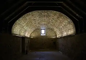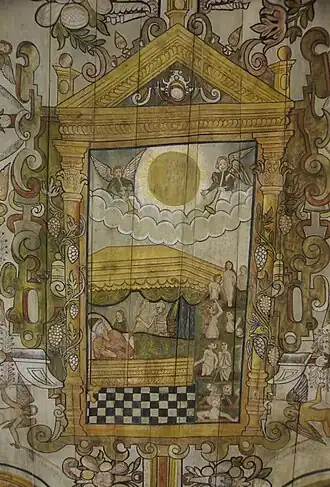 Het gebogen plafond is aan de oostelijke zijde over zeker 7,5 meter beschilderd met heraldische en symbolische onderwerpen.[2] Het is niet bekend of oorspronkelijk het gehele plafond beschilderd was.[5] Nadat het plafond was aangebracht in de kerk, werd het beschilderd met natuurlijke pigmenten.[4]