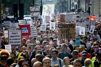 Vlak bij Hyde Park in Londen betoogden enkele duizenden mensen tegen het bezoek.[9] Tot de betoging werd opgeroepen door een coalitie van verenigingen die hun ongenoegen uitten over gevallen van kindermisbruik en wat zij zien als discriminatie van vrouwen en homoseksuelen in de Kerk. Overigens sprak de paus tijdens zijn bezoek twee keer uitdrukkelijk zijn afkeuring en afschuw uit over het misbruik in de Kerk. Zo liet hij op de heenreis aan de meegereisde journalisten weten dat alle onthullingen daarover een grote schok voor hem waren geweest. Hij zei tevens het te betreuren dat de leiding van de Kerk zo inadequaat had gereageerd op het misbruik.[10] In zijn preek tijdens de mis die hij opdroeg in de Kathedraal van Westminster zei hij onder meer: