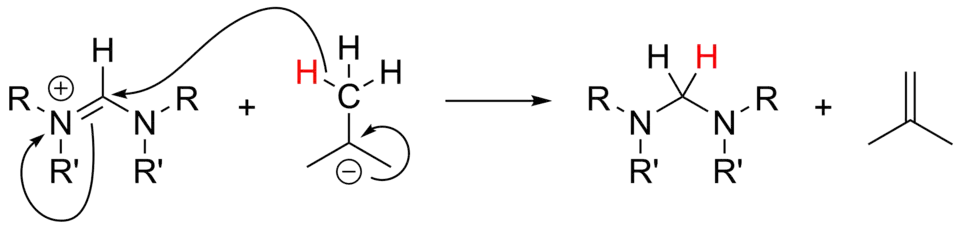 Een eerste gedachte zou zijn dat natrium- of kaliumhydride[26][32] de ideale basen zouden zijn. Deprotoneren vindt plaats met ontwikkeling van waterstofgas, een irreversibele reactie. Het gewenste carbeen ontstaat, samen met wat anorgaische bijproducten. Deze, en een teveel aan hydride, laten zich via filtreren verwijderen. In de praktijk blijkt deze reactie echter zeer traag. Toevoegen van DMSO versnelt de reactie, maar heeft ook het risico in zich van onbedoelde zijreacties (zie: onderste figuur in Base en nucleofiel)[17][25]