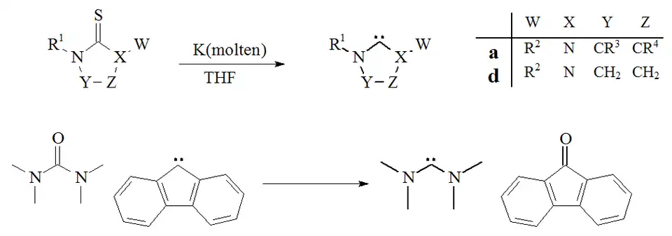 Een andere benadering wordt gevonden door het carbeen te maken op basis van het verwijderen van zwavel uit een thioureum met behulp van kalium in THF.[27][75] Een bijkomend voordeel van deze benadering is dat het bijproduct van de reactie, kaliumsulfide onoplosbaar is in het gebruikte oplosmiddel. De in deze methode gebruikte hogere temperatuur maakt deze methode wel minder geschikt voor carbenen die gevoelig zijn voor dimerisatie. Er is een voorbeeld bekend van het verwijderen van zuurstof uit een ureum-derivaat. Met behulp van een van fluoreen afgeleid carbeen wordt het bis(dimethylamino)carbeen verkregen, naast fluorenon:[76]