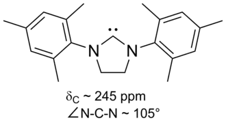 - ↑ a b c Arduengo, A.J., Harlow, R.L., Kline, M. (1991). A stable crystalline carbene. J. Am. Chem. Soc. 113 (1): 361–363. DOI: 10.1021/ja00001a054.