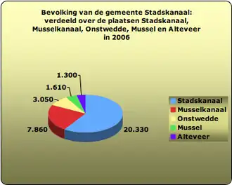 In de gemeente Stadskanaal liggen onder meer de volgende plaatsen: Alteveer (gedeeltelijk), Barlage, Blekslage, Braamberg, Ceresdorp, Höchte, Holte, Horsten, Kopstukken, Mussel, Musselkanaal, Onstwedde, Oomsberg, Smeerling, Stadskanaal, Sterenborg, Tange, Ter Maarsch, Ter Wupping, Veenhuizen, Vledderhuizen, Vledderveen, Vosseberg en Wessinghuizen.