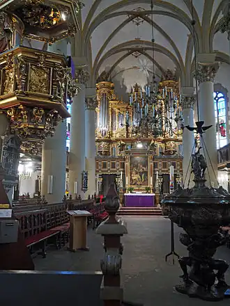 Het kerkgebouw is als drieschepige hallenkerk van acht traveeën ontworpen en heeft een zuidoostelijke oriëntatie. De vlakke polygonale afsluiting achter het altaar en het orgel dient als sacristie. De ruimte van de kerk met kruisribgewelven en maaswerkvensters is nog laatgotisch, de vormen komen echter overeen met een regionale renaissancestijl. De naar de stad en het slot gekeerde gevel is rijk versierd met maniëristische ornamenten.