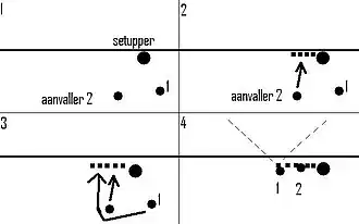 Bij deze aanval is het de bedoeling om de verdediging op het verkeerde been te zetten door een aanvaller een schijnaanval te laten uitvoeren. Dit gebeurt doordat een aanvaller als het ware onder de bal door loopt en na zijn schijnaanval de bal geslagen wordt door een aanvaller die achter hem langs is gelopen. De eerste aanvaller heeft, als het goed is, het blok met zich meegetrokken, waardoor de tweede aanvaller kan slaan zonder door het blok gehinderd te worden. Dit vergt oefening en een perfecte timing tussen de twee aanvallers en de spelverdeler.