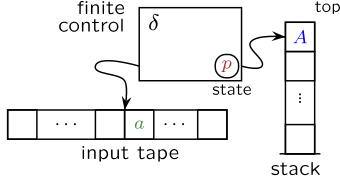 Een stapelautomaat accepteert een woord w, als w geschreven kan worden als , waarbij , als er een rij van toestanden en een rij van stapelinhouden () zijn, zo dat