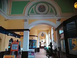 De ingang van de vestibule bevat een klassiek portaal met daarboven een driehoekige gevel en raam. Ook hangt er een klok boven de deur. De binnenzijde van de vestibule is anderhalve verdieping hoog. De muren van de vestibule waren oorspronkelijk versierd met bloemmotieven. Het interieur is vergelijkbaar met dat van de vestibule van het stationsgebouw in Bielsko-Biała, dat eveneens ontworpen is door architect Anton Dachler.